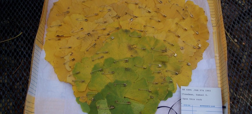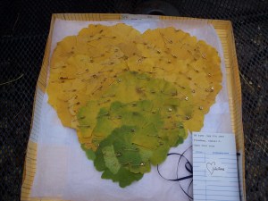 Julie-Anna, photographer, painter, sculptor, gave us this heart made of ginkgo leaves—which themselves resemble hearts. Julie-Anna has at least one large ginkgo tree in their yard, and we have one in ours. Every fall, the trees’ leaves all turn yellow at the same time and fall soon after in a blizzard of gold. The leaves are associated with memory, so the symbolism is perfect—furthermore, she safety-pinned the leaves together, suggesting that memory is fragile, sometimes hanging by a thread, and yet also bound together with other memories. The gift was bound by love, just as loss is.