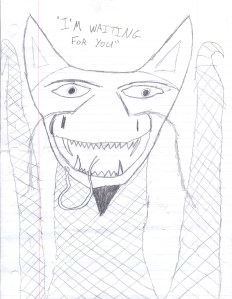 Once Casey told me that during a particularly ugly trip—I think it was during a brief time when he used crack—he saw a demon. It scared him. Later, going through his writing (he was prolific), I found this drawing, which I take to be that demon, with its ominous warning, “I’m waiting for you.”