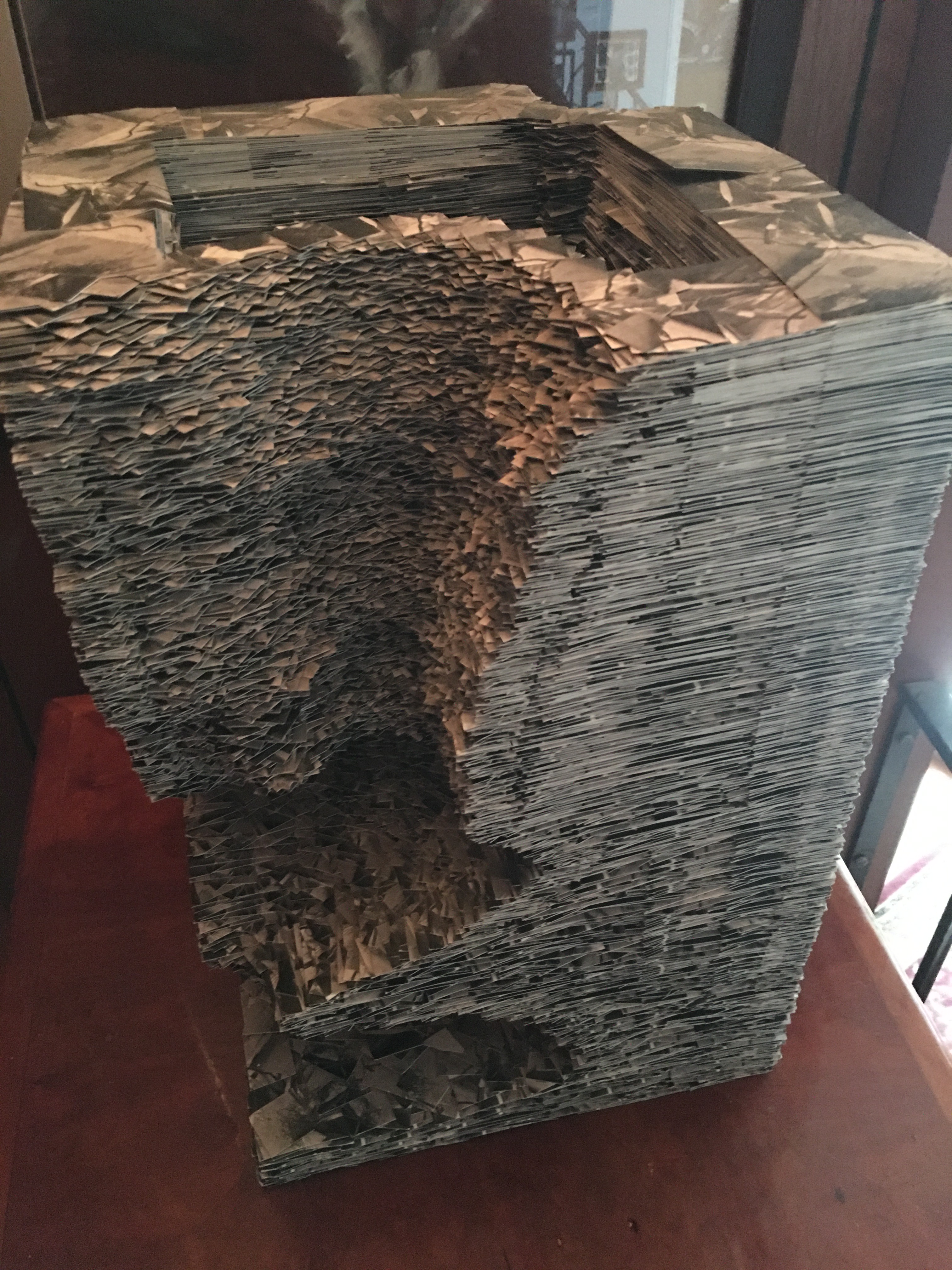 Memory is also the theme of three pieces that Galen created. The Black Hole of Memory was about 6’x4’x4′ and covered with images of Casey and his two brothers and us parents. The second is his sketch of Casey, from a photo taken for his senior prom. The third is a tower, again of pieces of photos repeated over and over. The tower is hollowed out inside and cut out on the edges to reflect the carved up nature of memory.