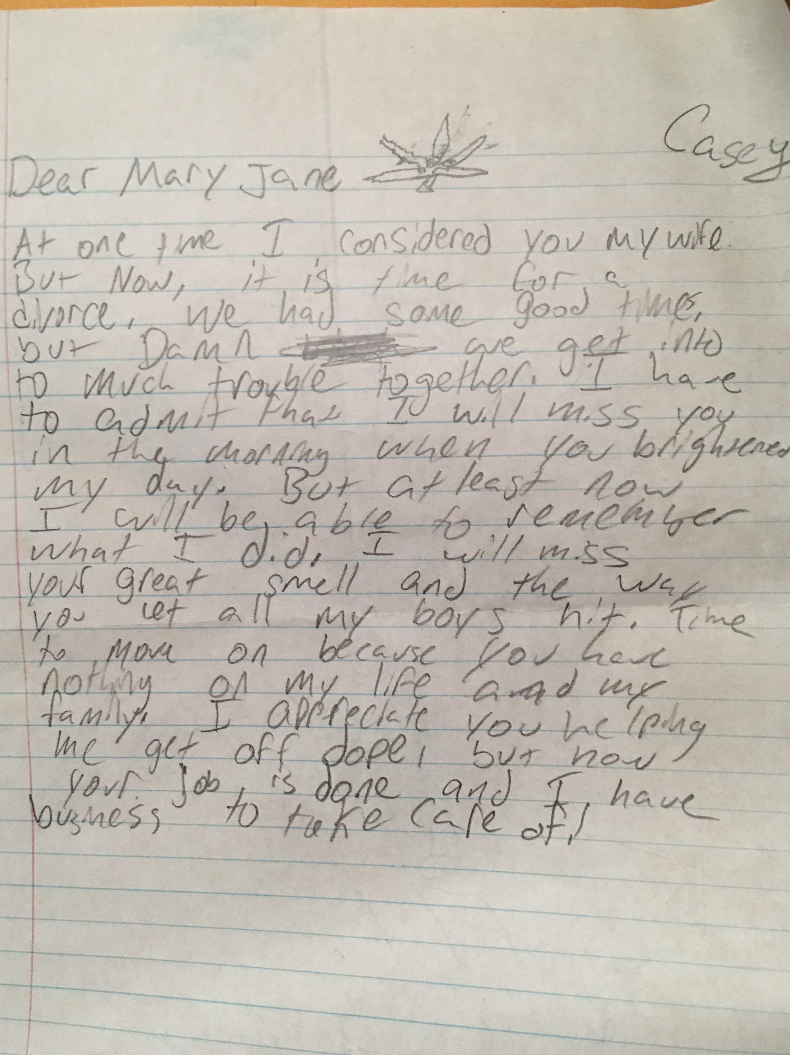 Here’s something Casey wrote, a letter to “Mary Jane.”